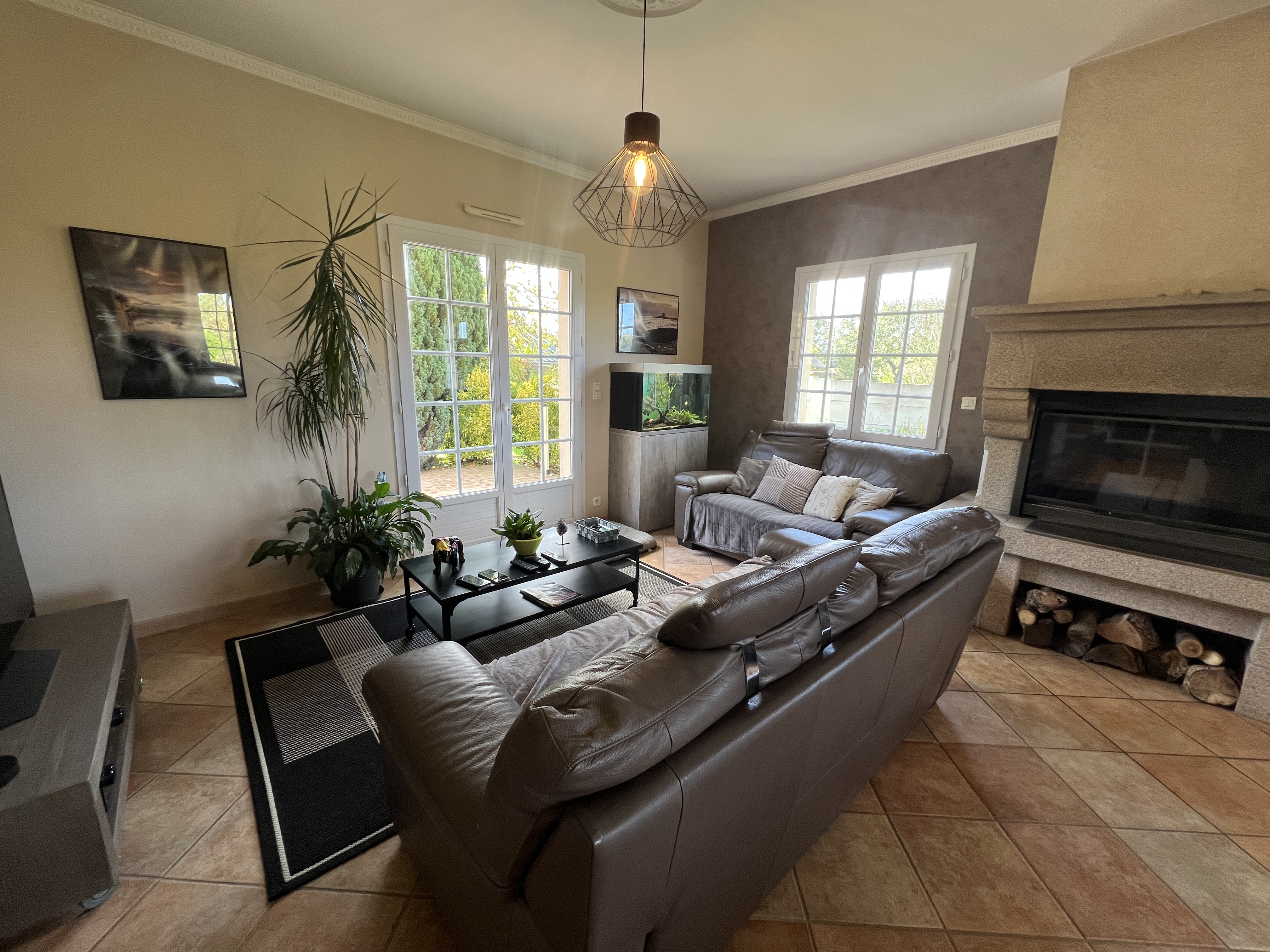 Séjour-salon chaleureux avec cheminée insert et diffuseur de chaleur, d’une superficie de 36m²
