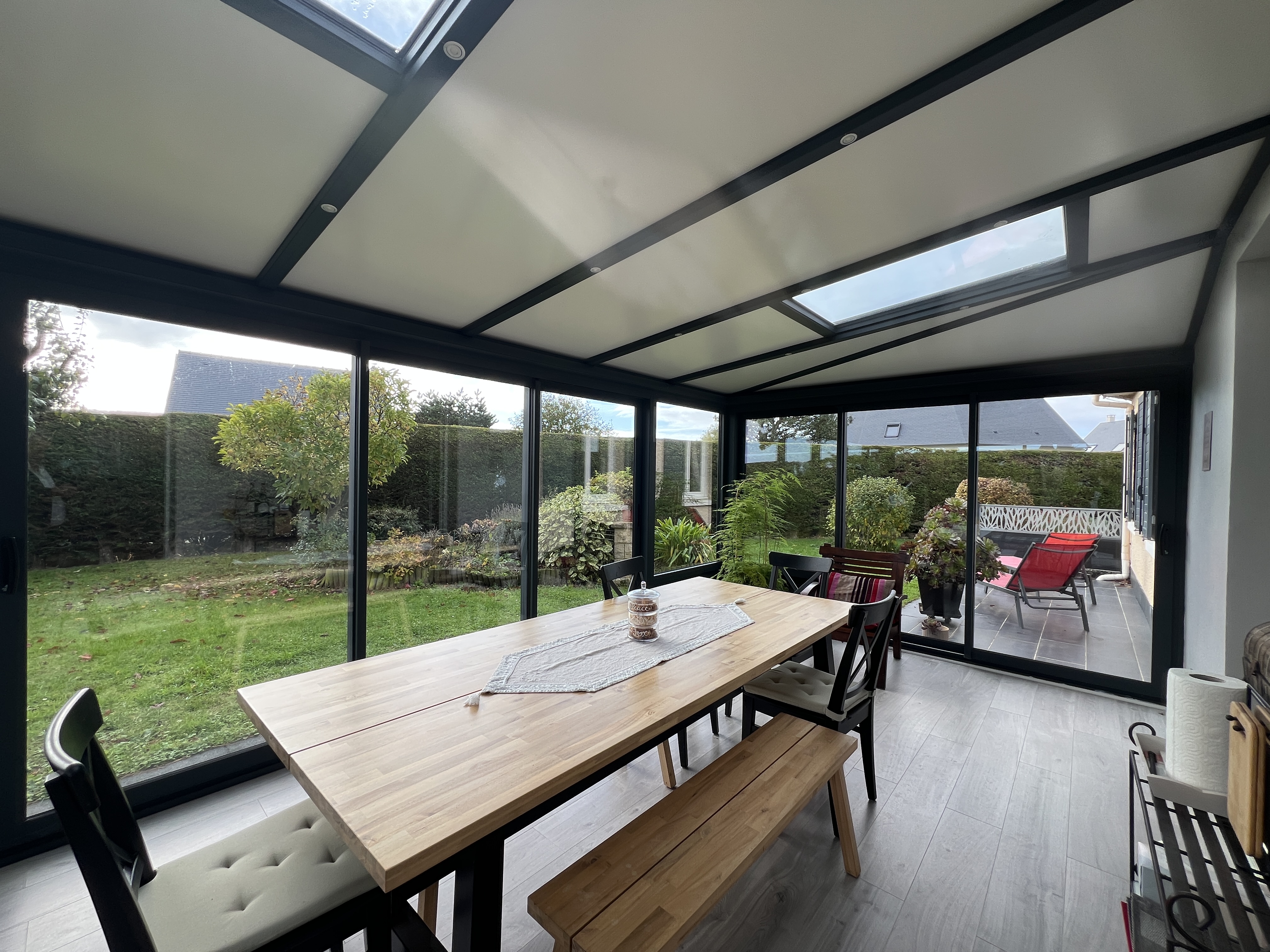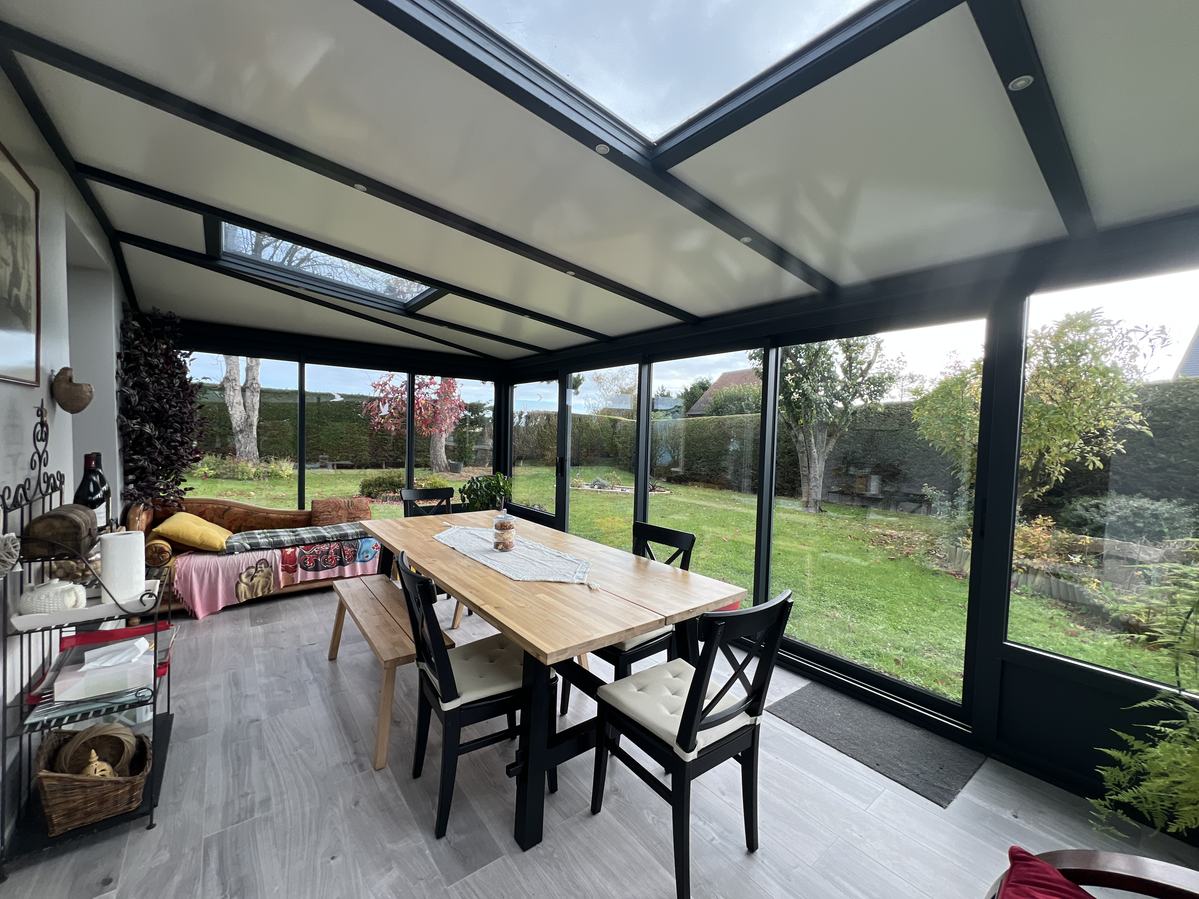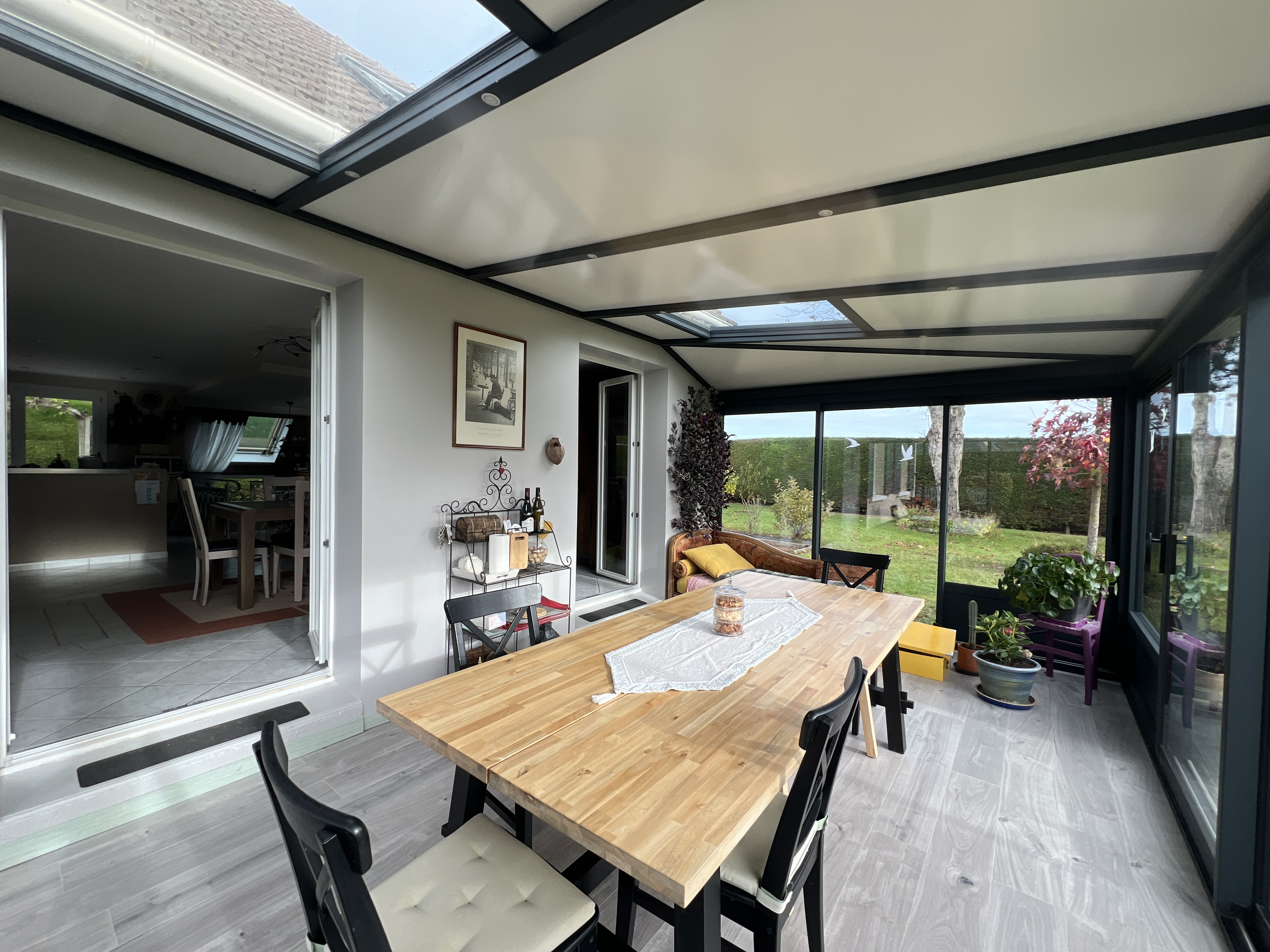 Véranda aménagée en salle à manger, ouverte sur le jardin