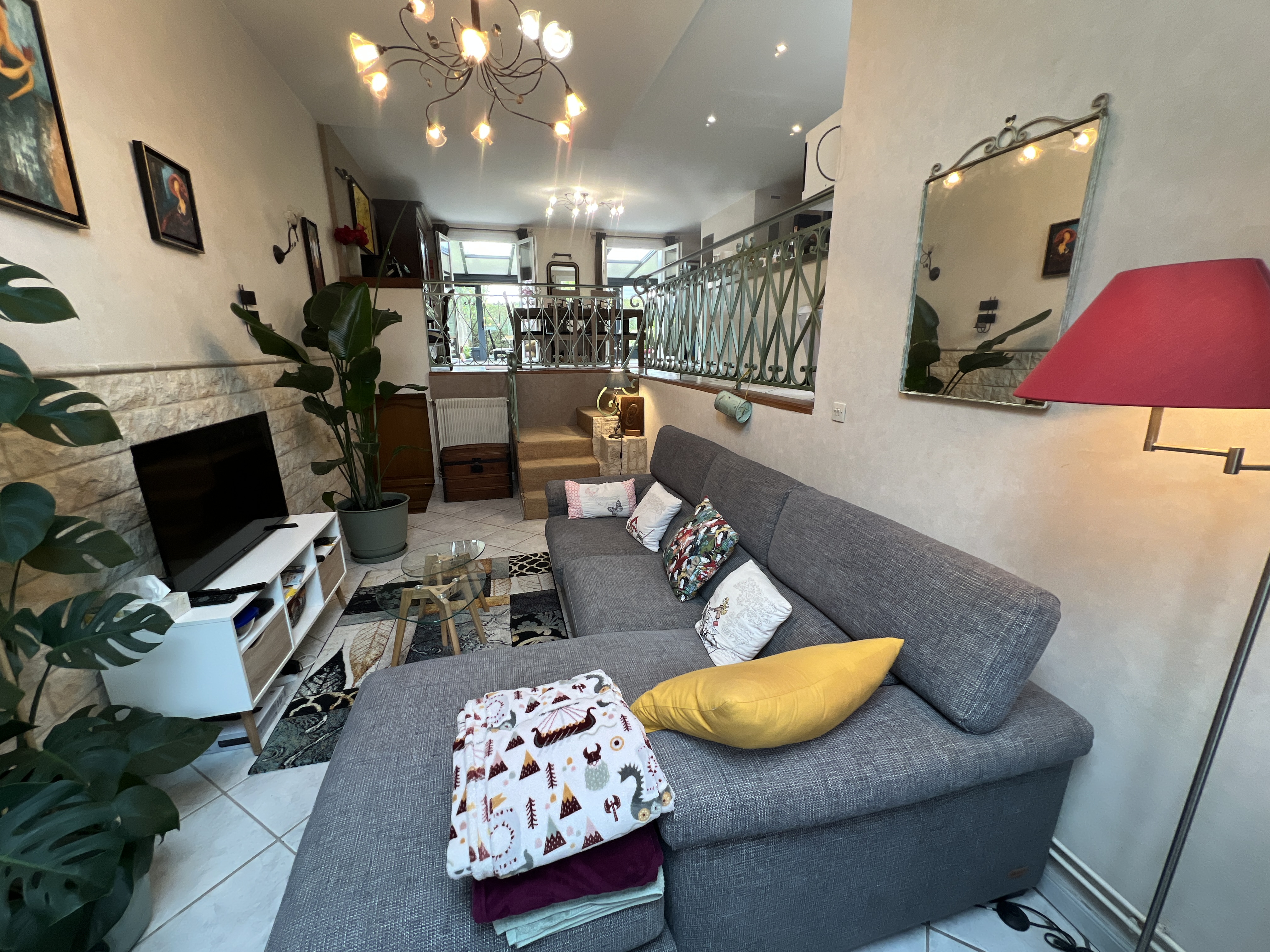Séjour spacieux, lumineux, avec cheminée insert bois apportant chaleur et ambiance conviviale